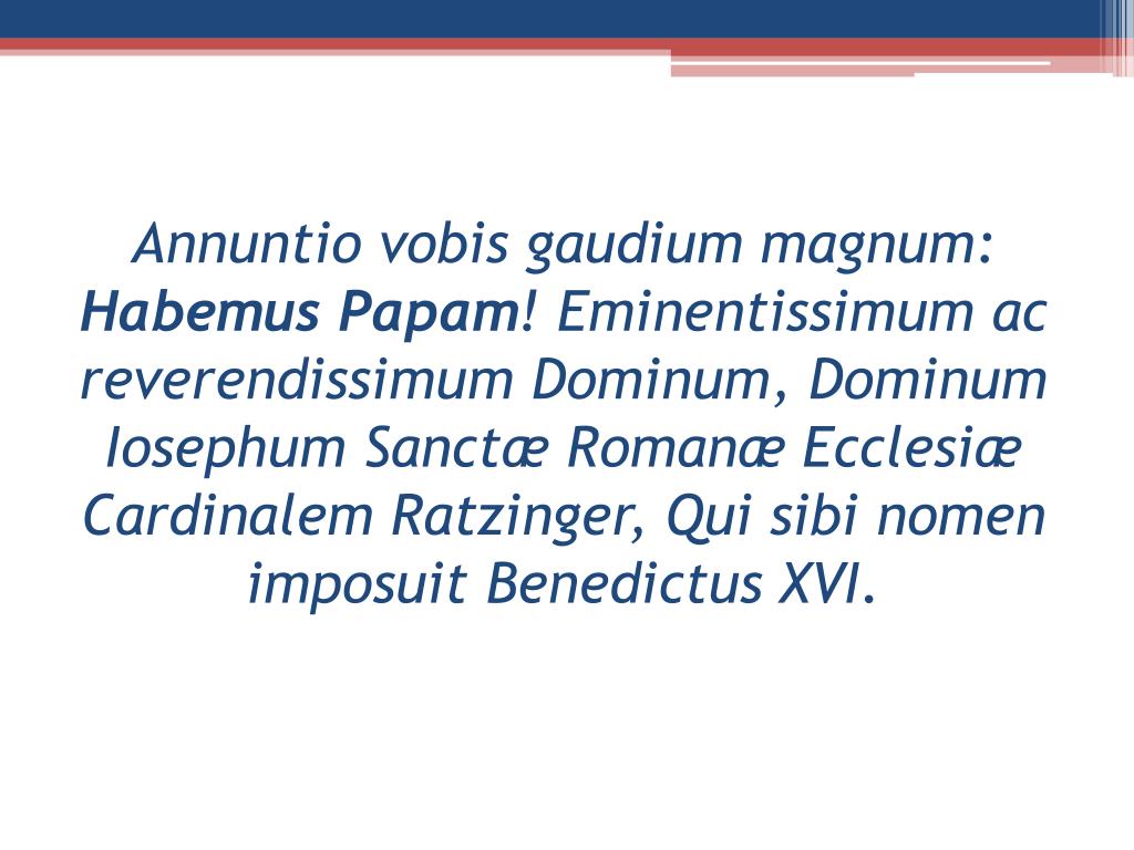 Annuntio vobis gaudium magnum: Habemus Papam! Eminentissimum ac reverendissimum Dominum, Dominum Iosephum Sanctæ Romanæ Ecclesiæ Cardinalem Ratzinger, Qui sibi nomen imposuit Benedictus XVI.