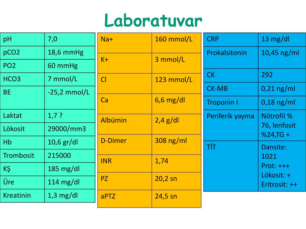 Olgu • GKS: E1 M1Ventübe, 4,0 kaflı tüp • Göz: Pupiller miyotik, IR (+/+), • SS: 45/dk, KTA: 144/dk/R, KB: 69/30 mmHg, • SaO2: 96, KDZ > 3 sn, Ateş: 36,7 C • Ağırlık: 17 kg (50. persentil) • Cilt: Soluk, soğuk, turgor azalmış • Solunum:Yaygın kaba ral • KVS: Taşikardi • GİS: Normal