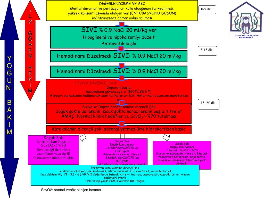 Y O Ğ U N B A K I M i L K G Ö R E N H E K i M DEĞERLENDİRME VE ABC Mental durumun ve perfüzyonun kötü olduğunun farkedilmesi, yüksek konsantrasyonda oksijen ver (ENTÜBASYONU DÜŞÜN) iv/intraosseoz damar yolun açılması 0-5 dk SIVI % 0.9 NaCl 20 ml/kg ver Hipoglisemi ve hipokalsemiyi düzelt Antibiyotik başla 5-15 dk Hemodinami Düzelmedi SIVI: % 0.9 NaCl 20 ml/kg Hemodinami Düzelmedi SIVI: % 0.9 NaCl 20 ml/kg SIVIYA DİRENÇLİ ŞOK Dopamin başla, havayolunu güvenceye al (ENTÜBE ET), Atropin ve ketamin kullanarak santral kateter tak: Arter kan basıncını monitorize et 15 -60 dk Sıvıya ve Dopamin/dobutamine dirençli Şok Soğuk şokta adrenalin, sıcak şokta noradrenalin başla, titre et AMAÇ: Normal klinik hedefler ve ScvO2 > %70 tutulması Katekolamin dirençli şok: adrenal yetmezlikte hidrokortizon başla Soguk Sok Normal kan basıncı ScvO2 < %70 Sıvı desteği ile birlikte vazodilatör veya tip III fosfoesteraz inhibitörü ekle Soguk Sok Düşük kan basıncı 1.Hedef:ScvO2>%70 ve Hb>10g/dl Adrenalini ve sıvıyı titre et 2.hedef: ScvO2<%70 ise +NE,yada dobutamin+levosimendan,yada+milrinon yada emoksimon Sicak Sok Düşük kan basınci 1.hedef: ScvO2 %70 Sıvı ve noradrenalini titre et, 2.hedef: Vazopresin,terlipresin, anjiotensin, Hala scvo2 düşükse dobutamin yada adrenalin Persistan katekolamine dirençli sok Perikardial efüzyon, pneumotoraks, intraabdominal P>12, ekarte et, varsa tedavi et Kalp debisini ölç: CI > 3.3 < 6 L/dk/m2 değerlerde tutmak için sıvı, inotrop, vazopresör, vazodilatör ve hormon tedavisini ayarla Hala vevap yoksa ECMO ve/veya RRT düşün ScvO2: santral venöz oksijen basıncı