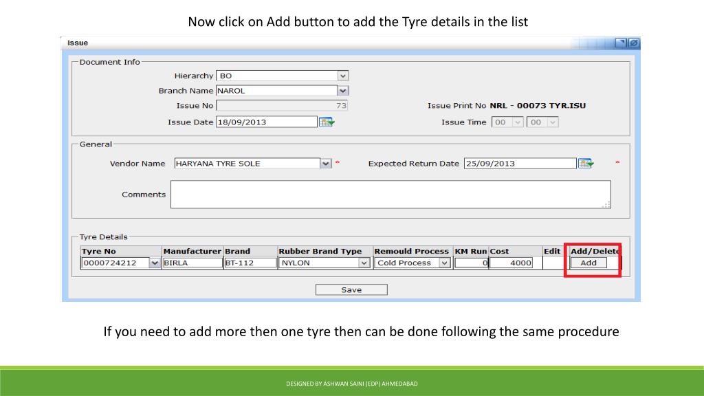 Now click on Add button to add the Tyre details in the list If you need to add more then one tyre then can be done following the same procedure Designed by Ashwan Saini (EDP) Ahmedabad