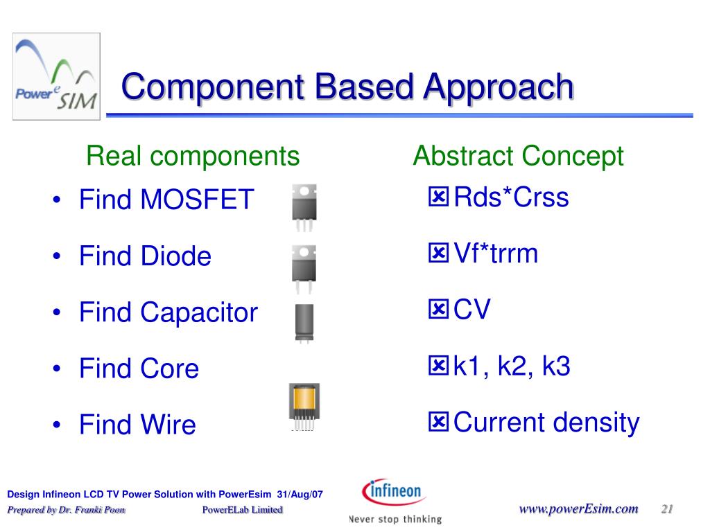 Find MOSFET Find Diode Find Capacitor Find Core Find Wire Component Based Approach Real components Abstract Concept • Rds*Crss • Vf*trrm • CV • k1, k2, k3 • Current density