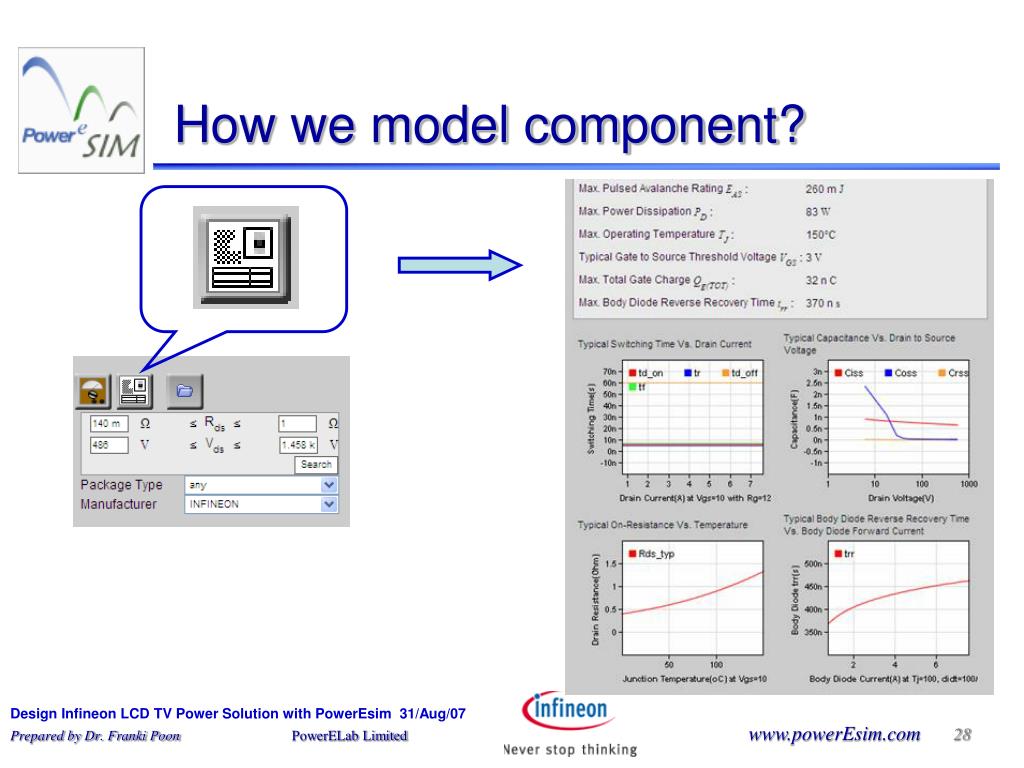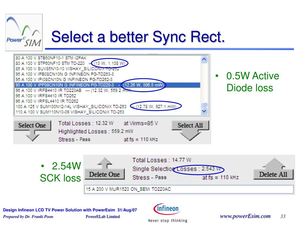 Design Infineon LCD TV Power Solution with PowerEsim. Poweresim. Measurement. 100.00. 90.00. 80.00. 70.00. 60.00. 50.00. 40.00. 30.00. 20.00. 10.00. 0.00. 85. 110. 230. 265. Our junior Engineer Gary spend . . . . 1 days to design - Low cost 90% 150 W LCD power supply.