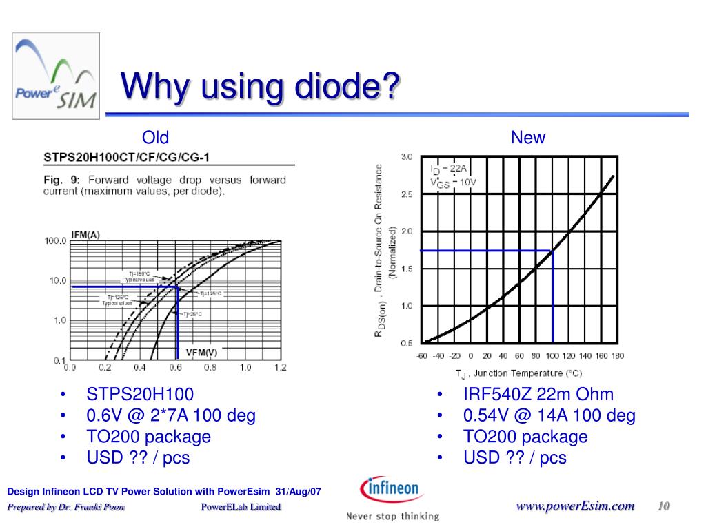 STPS20H100 0.6V @ 2*7A 100 deg TO200 package USD ?? / pcs Why using diode? Old New • IRF540Z 22m Ohm • 0.54V @ 14A 100 deg • TO200 package • USD ?? / pcs