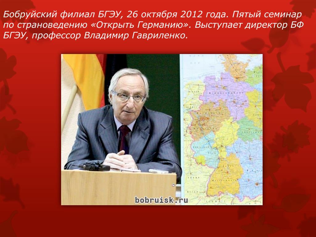 Бобруйский филиал БГЭУ, 26 октября 2012 года. Пятый семинар по страноведению «Открыть Германию». Выступает директор БФ БГЭУ, профессор Владимир Гавриленко.
