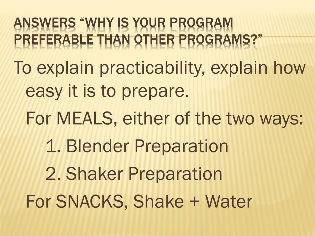 To explain practicability, explain how easy it is to prepare. For MEALS, either of the two ways: 1. Blender Preparation 2. Shaker Preparation For SNACKS, Shake + Water Answers “Why is your program preferable than other programs?”