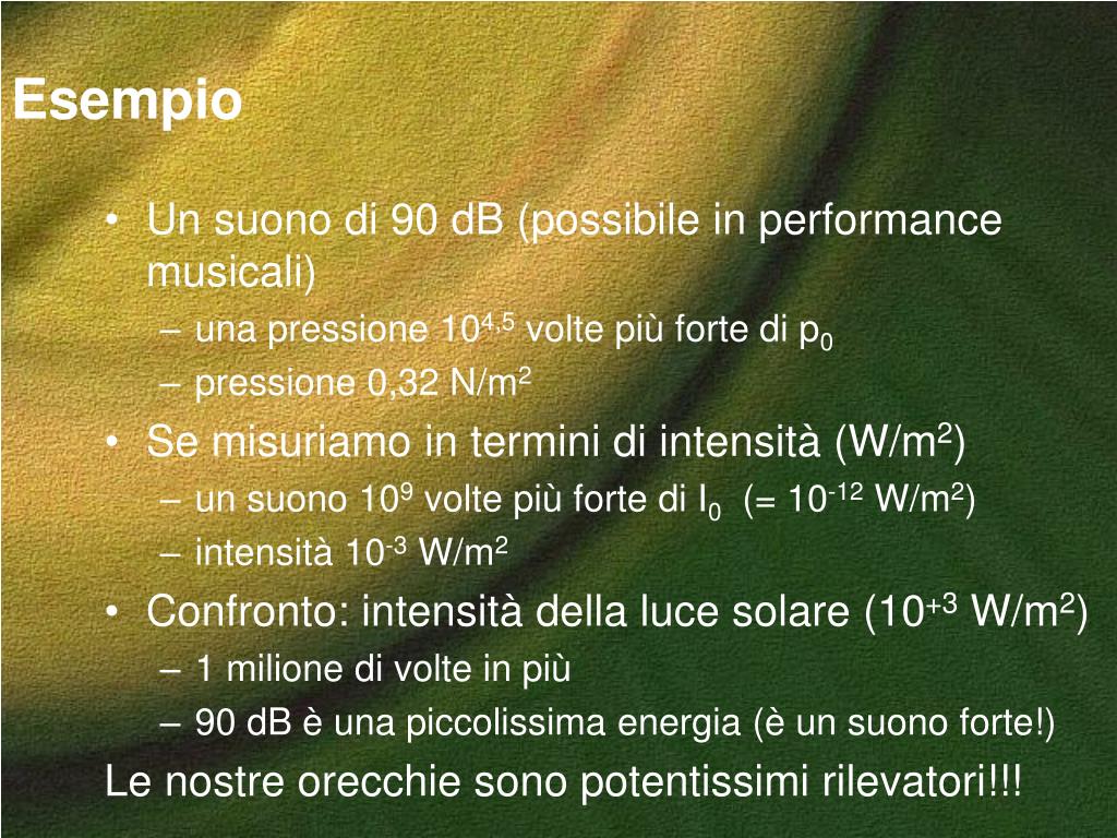 Esempio • Un suono di 90 dB (possibile in performance musicali) • una pressione 104,5 volte più forte di p0 • pressione 0,32 N/m2 • Se misuriamo in termini di intensità (W/m2) • un suono 109 volte più forte di I0 (= 10-12 W/m2) • intensità 10-3 W/m2 • Confronto: intensità della luce solare (10+3 W/m2) • 1 milione di volte in più • 90 dB è una piccolissima energia (è un suono forte!) Le nostre orecchie sono potentissimi rilevatori!!!