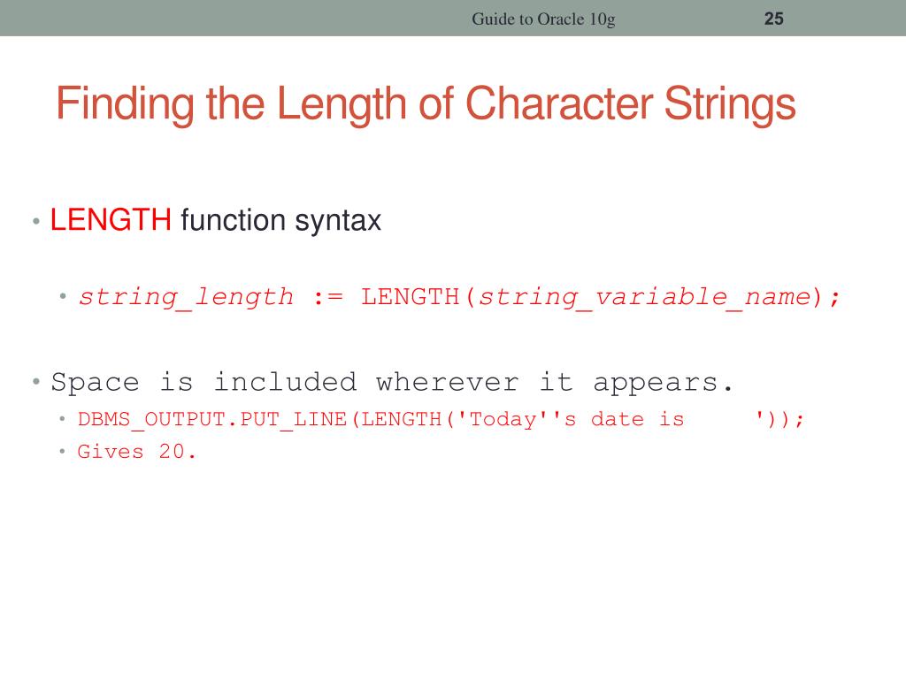 Guide to Oracle 10g Finding the Length of Character Strings • LENGTH function syntax • string_length := LENGTH(string_variable_name); • Space is included wherever it appears. • DBMS_OUTPUT.PUT_LINE(LENGTH('Today''s date is ')); • Gives 20.