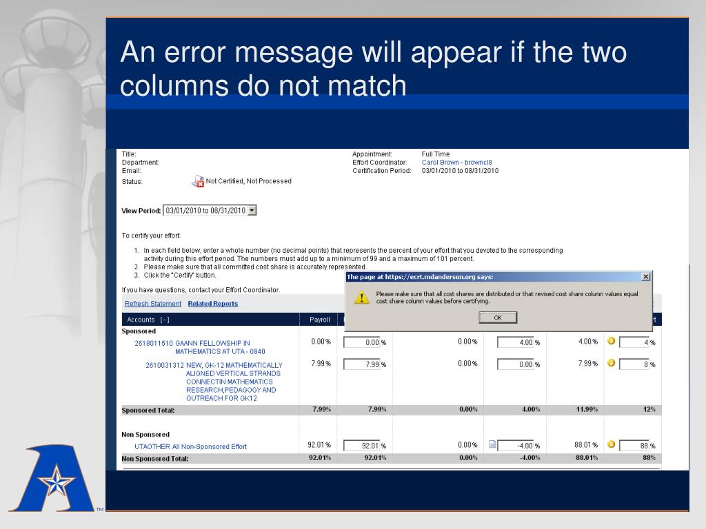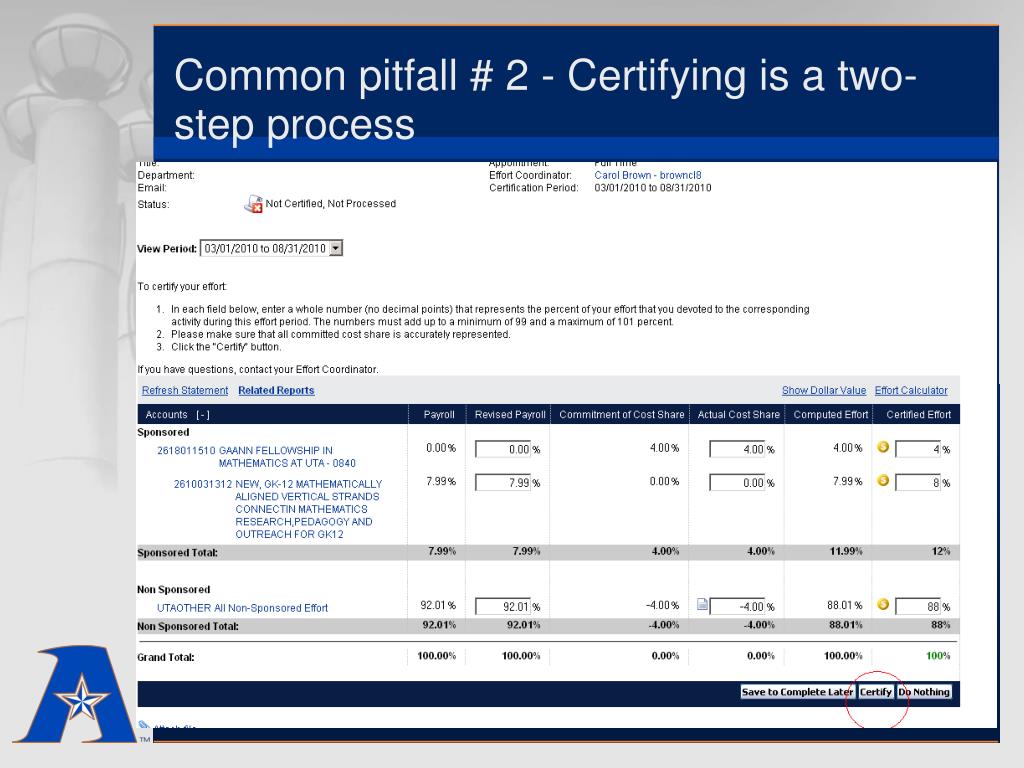 Don’t forget to certify your support staff ! All faculty members (PIs, CoIs, Is) certify their own effort Non-faculty/support personnel need to be certified by the PI