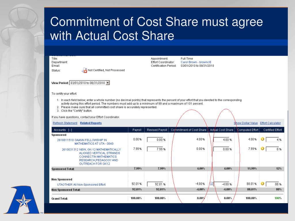 Overall, Effort Reporting is a mechanism to confirm that the salary charged to sponsors was reasonably allocated for the actual time devoted. Additionally, Effort Reporting is used to certify cost share commitments.