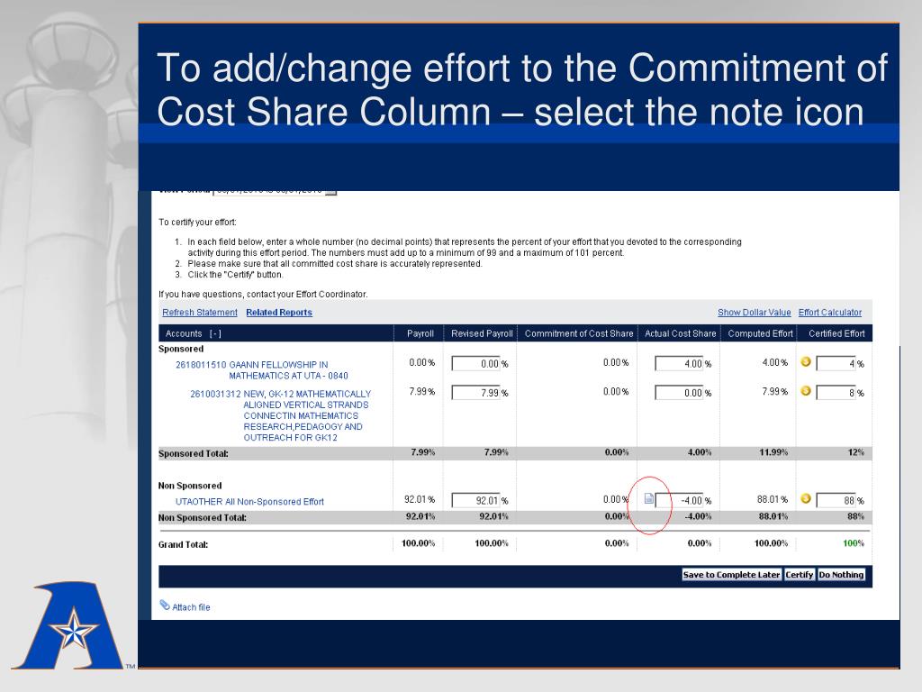 To add/change effort to the Commitment of Cost Share Column – select the note icon