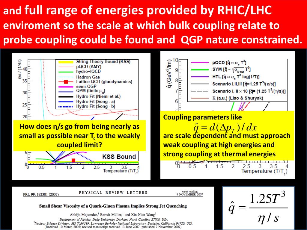 and full range of energies provided by RHIC/LHC enviroment so the scale at which bulk coupling relate to probe coupling could be found and QGP nature constrained. Coupling parameters like are scale dependent and must approach weak coupling at high energies and strong coupling at thermal energies How does η/s go from being nearly as small as possible near Tcto the weakly coupled limit?