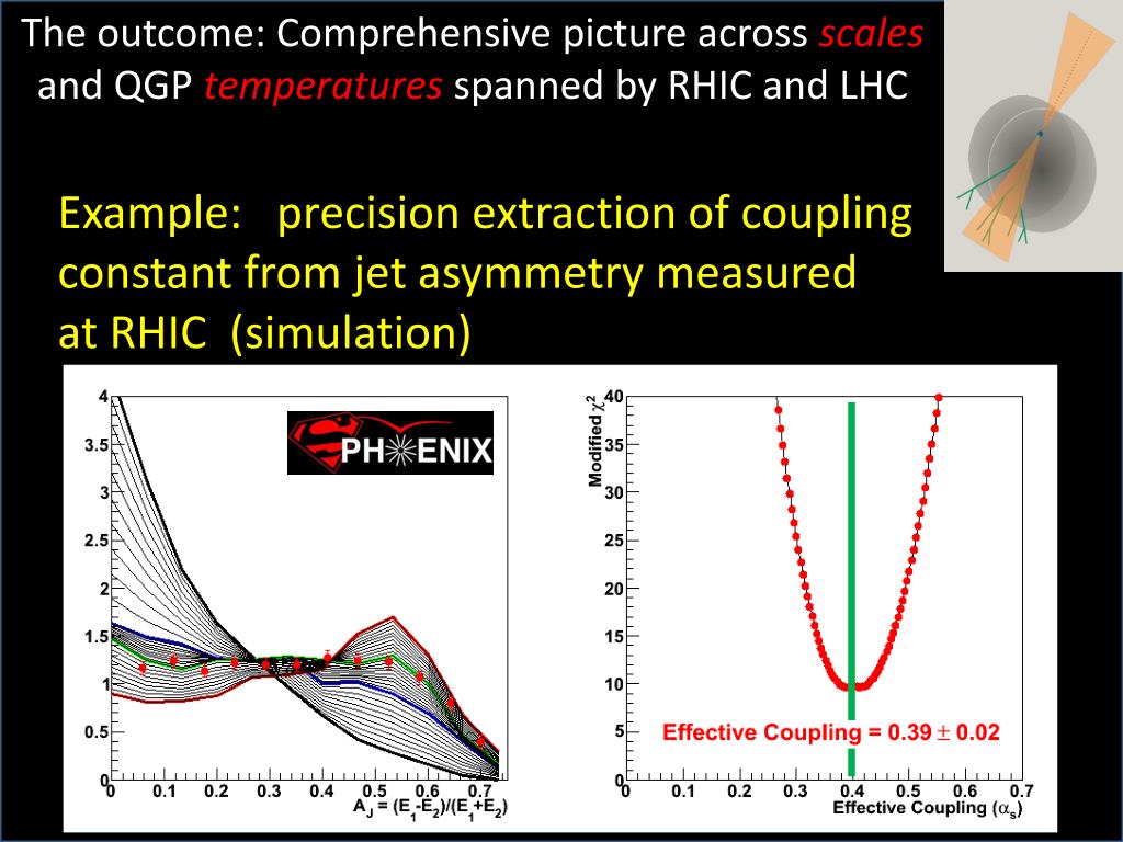 The outcome: Comprehensive picture across scales and QGP temperatures spanned by RHIC and LHC Example: precision extraction of coupling constant from jet asymmetry measured at RHIC (simulation)