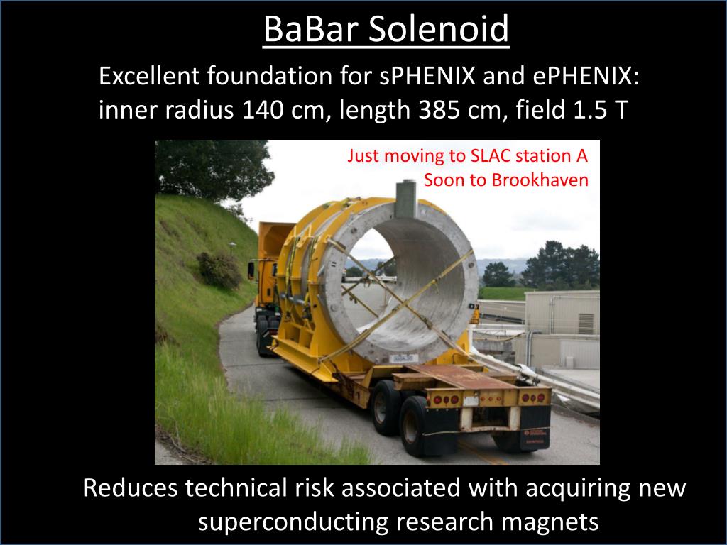 BaBarSolenoid • Excellent foundation for sPHENIX and ePHENIX: inner radius 140 cm, length 385 cm, field 1.5 T Just moving to SLAC station A Soon to Brookhaven • Reduces technical risk associated with acquiring new superconducting research magnets