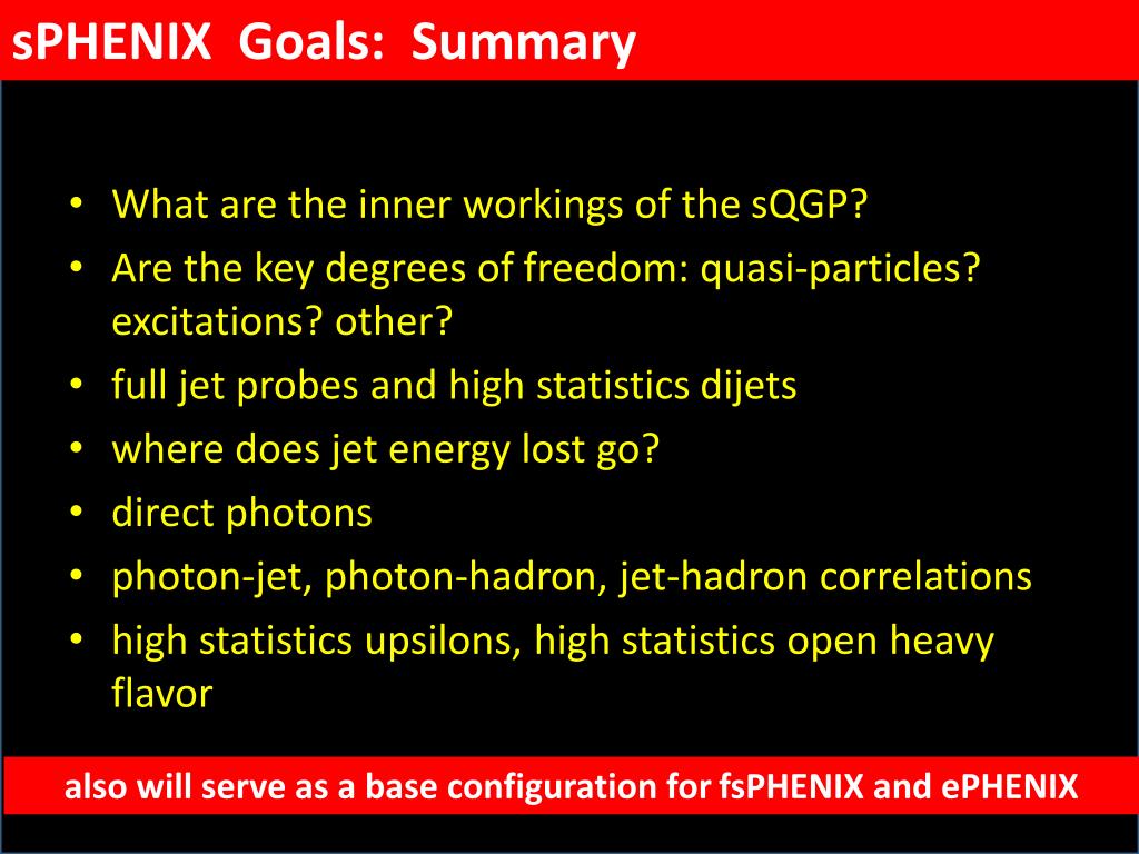 sPHENIX Goals: Summary • What are the inner workings of the sQGP? • Are the key degrees of freedom: quasi-particles? excitations? other? • full jet probes and high statistics dijets • where does jet energy lost go? • direct photons • photon-jet, photon-hadron, jet-hadron correlations • high statistics upsilons, high statistics open heavy flavor also will serve as a base configuration for fsPHENIX and ePHENIX