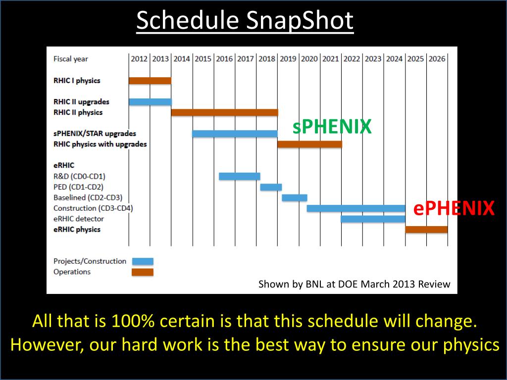 Schedule SnapShot sPHENIX ePHENIX Shown by BNL at DOE March 2013 Review All that is 100% certain is that this schedule will change. However, our hard work is the best way to ensure our physics