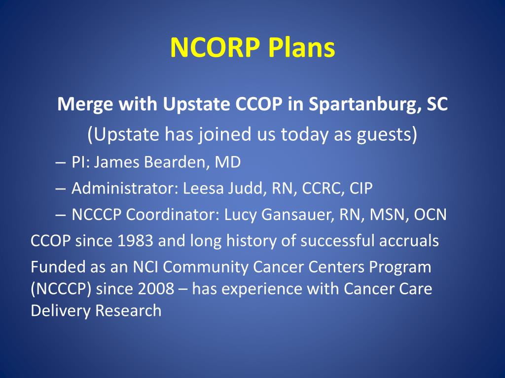 NCORP Plans Merge with Upstate CCOP in Spartanburg, SC (Upstate has joined us today as guests) • PI: James Bearden, MD • Administrator: Leesa Judd, RN, CCRC, CIP • NCCCP Coordinator: Lucy Gansauer, RN, MSN, OCN CCOP since 1983 and long history of successful accruals Funded as an NCI Community Cancer Centers Program (NCCCP) since 2008 – has experience with Cancer Care Delivery Research