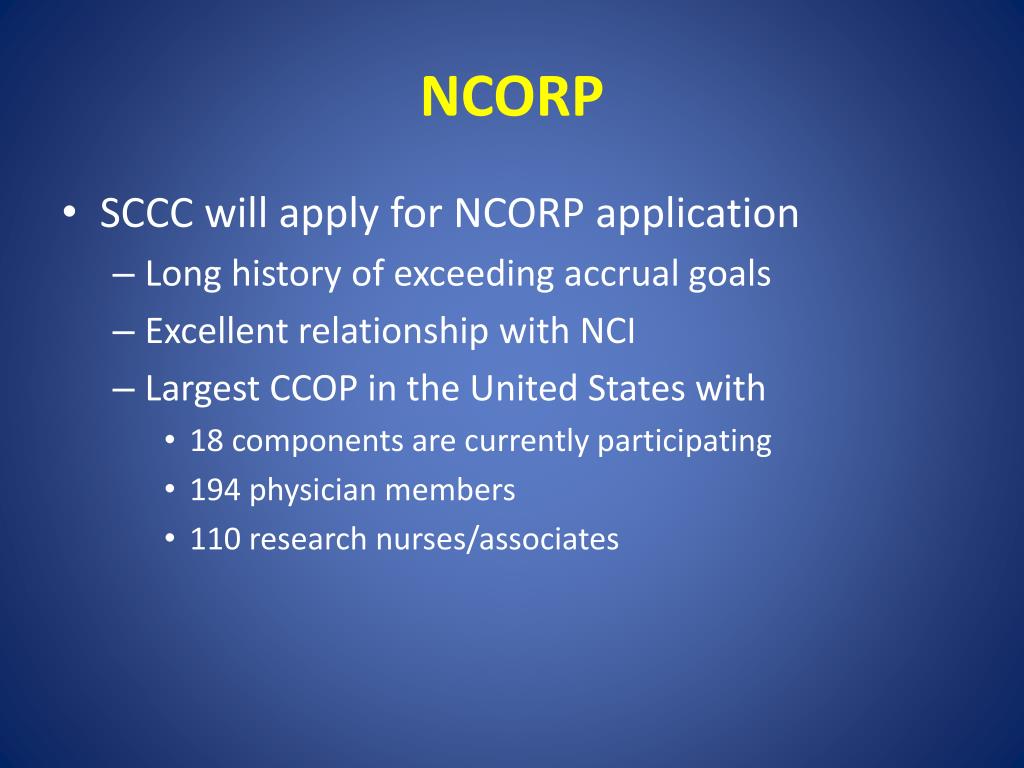 NCORP • SCCC will apply for NCORP application • Long history of exceeding accrual goals • Excellent relationship with NCI • Largest CCOP in the United States with • 18 components are currently participating • 194 physician members • 110 research nurses/associates