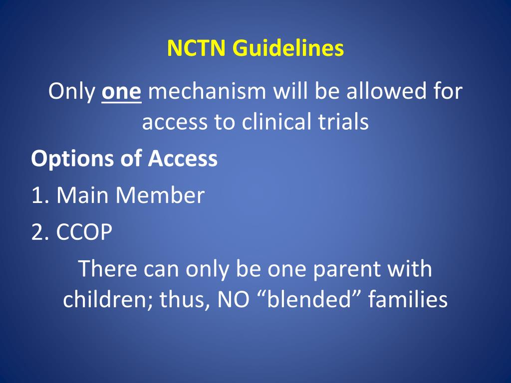 NCTN Guidelines Only one mechanism will be allowed for access to clinical trials Options of Access 1. Main Member 2. CCOP There can only be one parent with children; thus, NO “blended” families