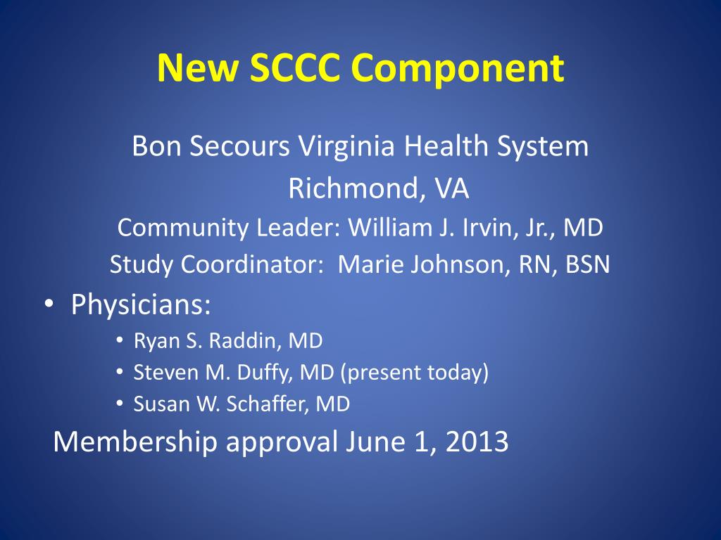 New SCCC Component Bon Secours Virginia Health System Richmond, VA Community Leader: William J. Irvin, Jr., MD Study Coordinator: Marie Johnson, RN, BSN • Physicians: • Ryan S. Raddin, MD • Steven M. Duffy, MD (present today) • Susan W. Schaffer, MD Membership approval June 1, 2013