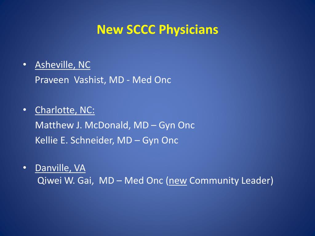New SCCC Physicians • Asheville, NC Praveen Vashist, MD - Med Onc • Charlotte, NC: Matthew J. McDonald, MD – GynOnc Kellie E. Schneider, MD – GynOnc • Danville, VA Qiwei W. Gai, MD – Med Onc (new Community Leader)