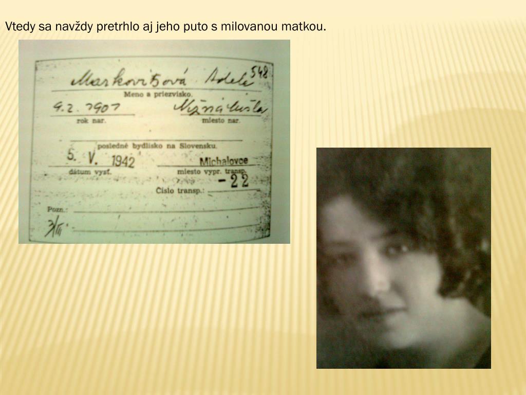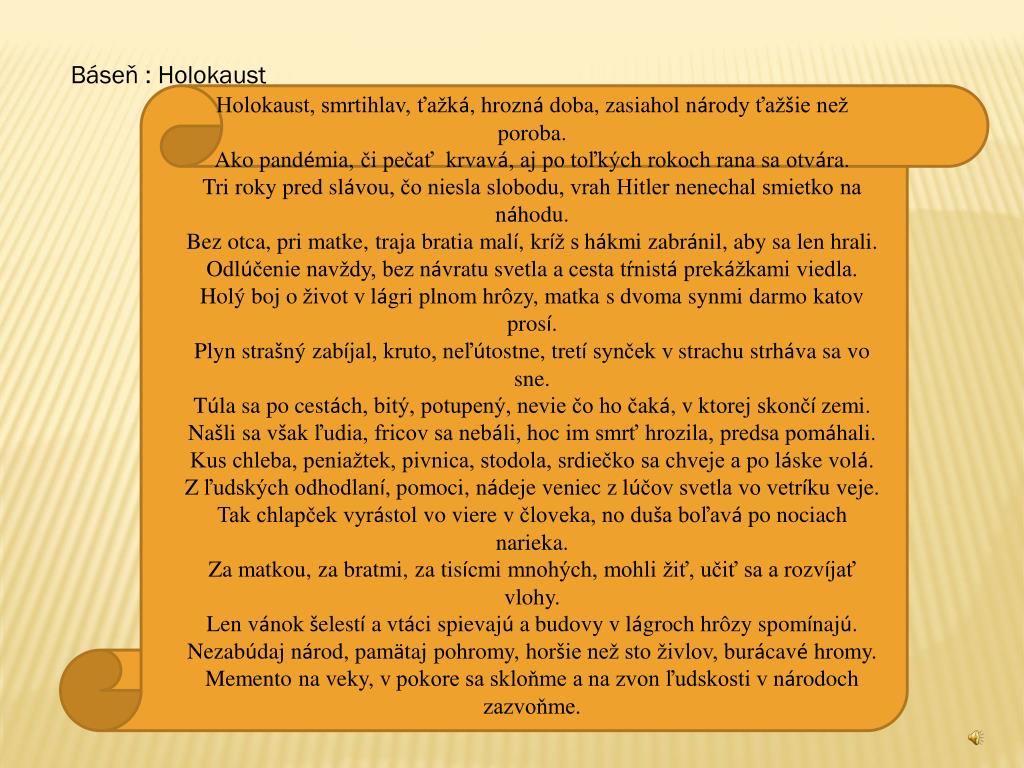 Báseň : Holokaust Holokaust, smrtihlav, ťažká, hrozná doba, zasiahol národy ťažšie než poroba. Ako pandémia, či pečať krvavá, aj po toľkých rokoch rana sa otvára. Tri roky pred slávou, čo niesla slobodu, vrah Hitler nenechal smietko na náhodu. Bez otca, pri matke, traja bratia malí, kríž shákmi zabránil, aby sa len hrali. Odlúčenie navždy, bez návratu svetla acesta tŕnistá prekážkami viedla. Holý boj oživot vlágri plnom hrôzy, matka sdvoma synmi darmo katov prosí. Plyn strašný zabíjal, kruto, neľútostne, tretí synček vstrachu strháva sa vo sne. Túla sa po cestách, bitý, potupený, nevie čo ho čaká, vktorej skončí zemi. Našli sa však ľudia, fricov sa nebáli, hoc im smrť hrozila, predsa pomáhali. Kus chleba, peniažtek, pivnica, stodola, srdiečko sa chveje apo láske volá. Zľudských odhodlaní, pomoci, nádeje veniec zlúčov svetla vo vetríku veje. Tak chlapček vyrástol vo viere včloveka, no duša boľavá po nociach narieka. Za matkou, za bratmi, za tisícmi mnohých, mohli žiť, učiť sa arozvíjať vlohy. Len vánok šelestí avtáci spievajú abudovy vlágroch hrôzy spomínajú. Nezabúdaj národ, pamätaj pohromy, horšie než sto živlov, burácavé hromy. Memento na veky, vpokore sa skloňme ana zvon ľudskosti vnárodoch zazvoňme.
