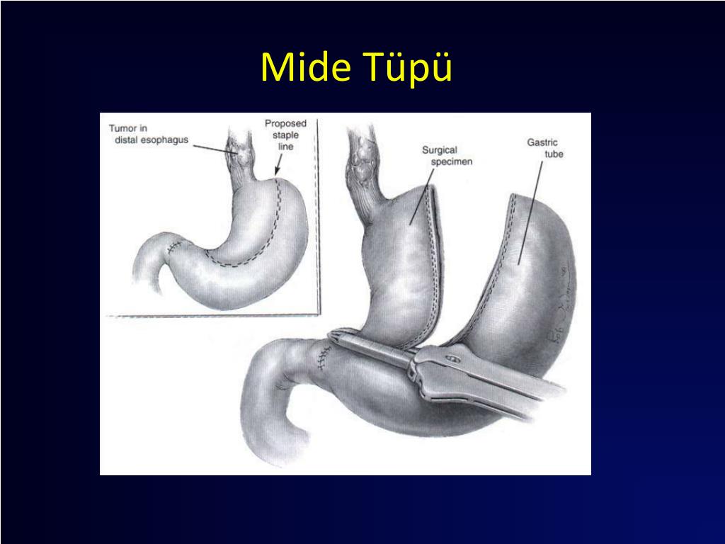 Cerrahi Teknik - ÜİÖ • Sağ torakotomi/torakoskopik özofagus serbestleştirmesi, lenfadenektomi, laparotomi, sol servikal özofagogastrostomi. • Pilor drenajı rutin değil. • Büyük kurvatür tüpü 4-5 cm. • Beslenme jejunostomisi.