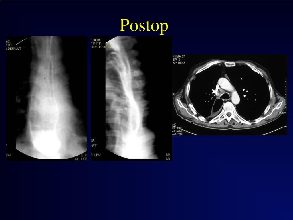 Luketich 2003, Ann Surg, 222 TLE Minör Komplikasyon (n 53/23.9%) Sayı (%) Majör Komplikasyon (n 71/32%) Sayı (%) Atriyal fibrilasyon 26 (11.7)Anastomoz kaçağı—tamamı 26 (11.7) Normal mide tüpü 10 (6.1) İnce mide tüpü 16 (25.9) Bronkoskopi gerektiren atelektazi 10 (4.5) Myocardial infarction 4 (1.8) Tüp gerektiren plevral efüzyon 14 (6.3) Gastric tip necrosis 7 (3.2) J-tube infection 1 (0.5) Delayed gastric emptying 4 (1.8) Clostridium difficile colitis 2 (0.9) Pancreatitis 3 (1.4) Wound infection 2 (0.9) Chylothorax 7 (3.2) Minor intraoperative tracheal perforation (1–2 mm) 2 (0.9) Tracheal tear 2 (0.9) Miscellaneous others 5 (2.25) Deep vein thrombosis 3 (1.4) Pulmonary embolus 3 (1.4) Pnömoni 17 (7.7) ARDS 4 (1.8) Vocal cord palsy 8 (3.6) Renal failure 2 (0.9) Miscellaneous others 4 (1.8)