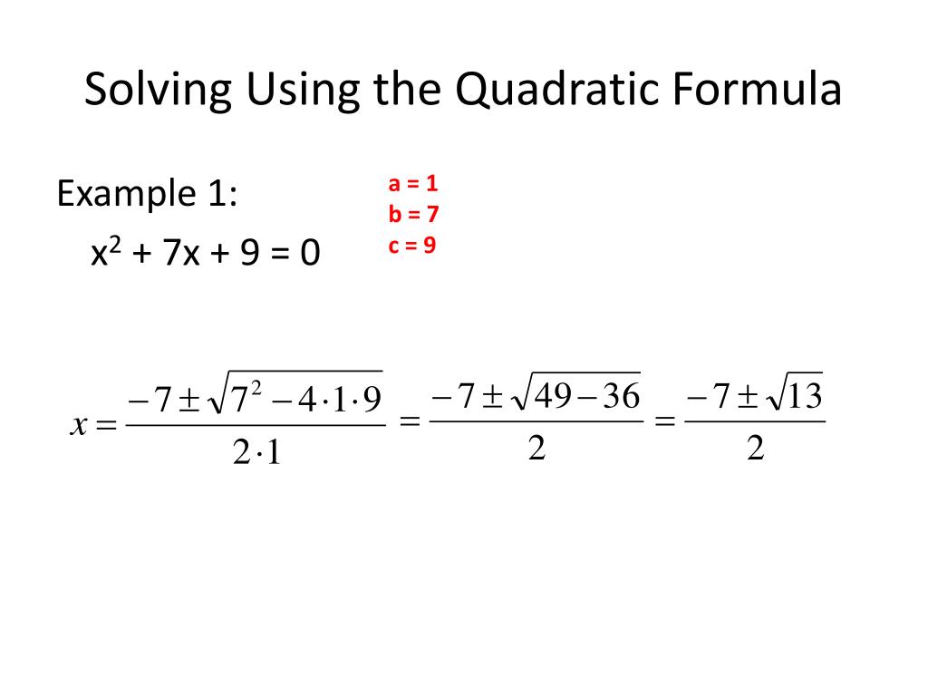 Solving Using the Quadratic Formula Example 1: x2 + 7x + 9 = 0 a = 1 b = 7 c = 9