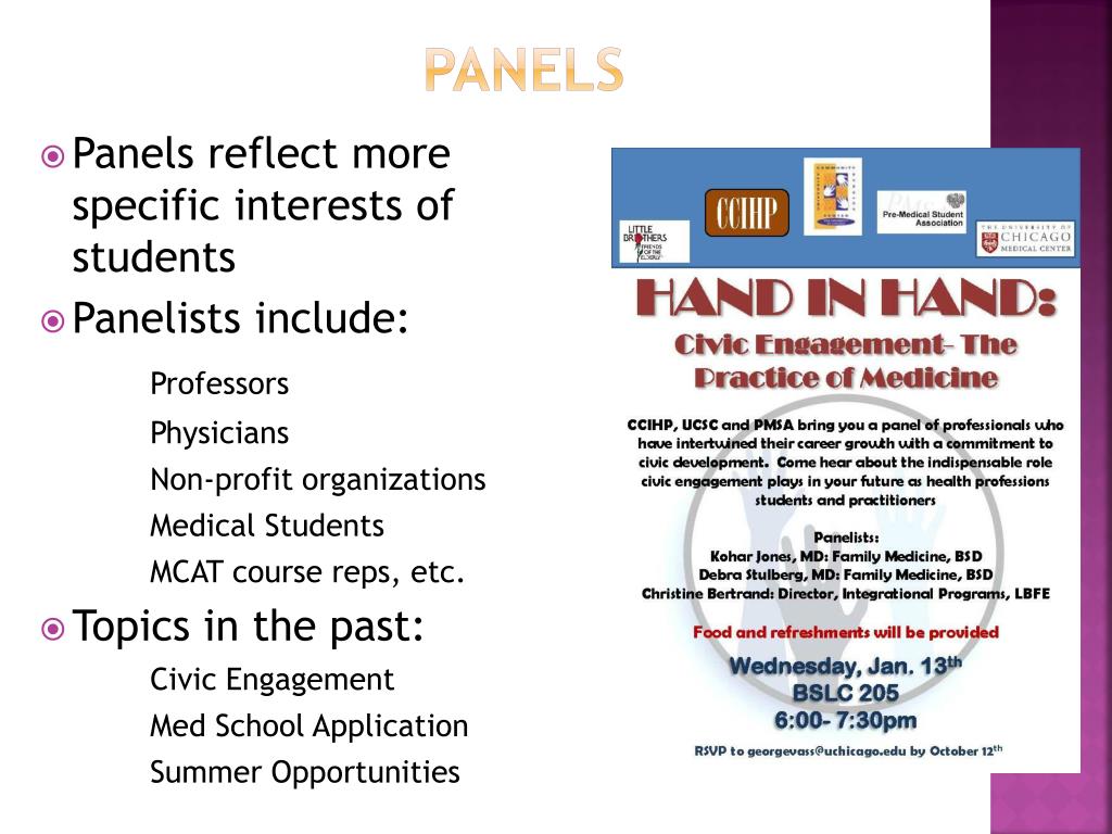 Panels • Panels reflect more specific interests of students • Panelists include: Professors Physicians Non-profit organizations Medical Students MCAT course reps, etc. • Topics in the past: Civic Engagement Med School Application Summer Opportunities