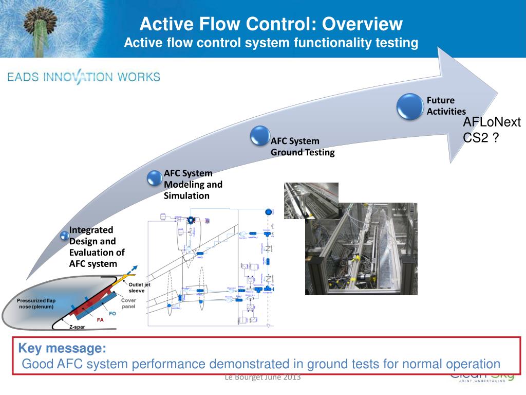 Active Flow Control: OverviewActive flow control system functionality testing AFLoNext CS2 ? Key message: Good AFC system performance demonstrated in ground tests for normal operation