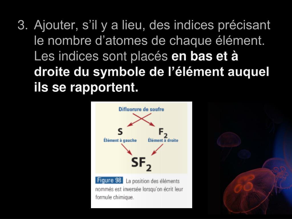 Ajouter, s’il y a lieu, des indices précisant le nombre d’atomes de chaque élément. Les indices sont placés en bas et à droite du symbole de l’élément auquel ils se rapportent.