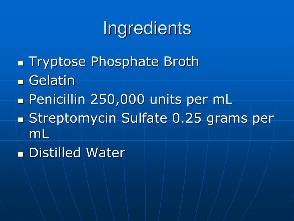 Ingredients • Tryptose Phosphate Broth • Gelatin • Penicillin 250,000 units per mL • Streptomycin Sulfate 0.25 grams per mL • Distilled Water