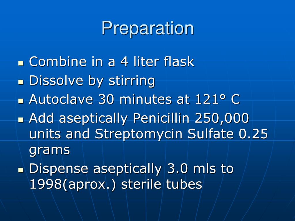 Preparation • Combine in a 4 liter flask • Dissolve by stirring • Autoclave 30 minutes at 121° C • Add aseptically Penicillin 250,000 units and Streptomycin Sulfate 0.25 grams • Dispense aseptically 3.0 mls to 1998(aprox.) sterile tubes