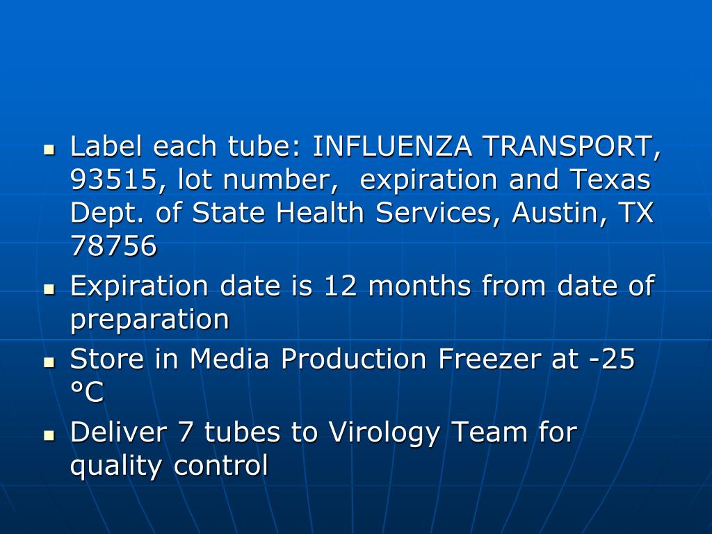 Label each tube: INFLUENZA TRANSPORT, 93515, lot number, expiration and Texas Dept. of State Health Services, Austin, TX 78756 • Expiration date is 12 months from date of preparation • Store in Media Production Freezer at -25 °C • Deliver 7 tubes to Virology Team for quality control