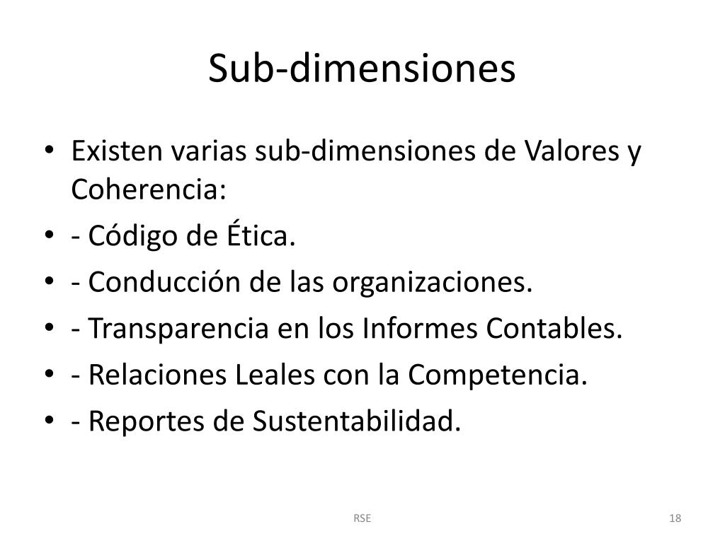 Sub-dimensiones • Existen varias sub-dimensiones de Valores y Coherencia: • - Código de Ética. • - Conducción de las organizaciones. • - Transparencia en los Informes Contables. • - Relaciones Leales con la Competencia. • - Reportes de Sustentabilidad. RSE