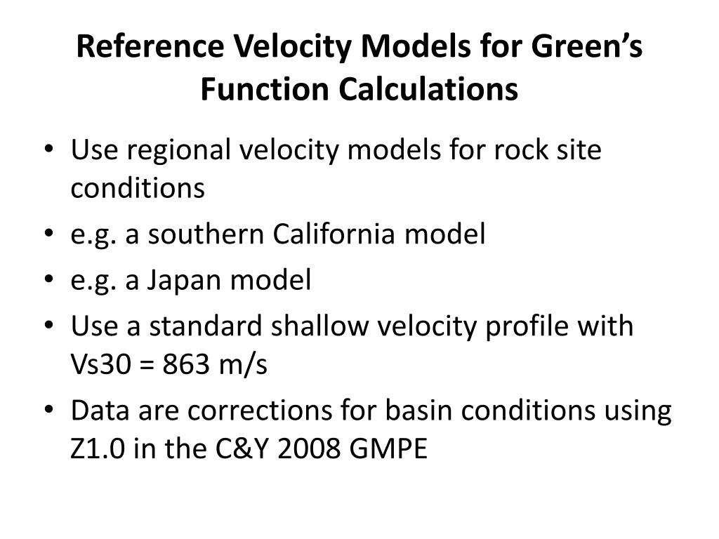 Reference Velocity Models for Green’s Function Calculations • Use regional velocity models for rock site conditions • e.g. a southern California model • e.g. a Japan model • Use a standard shallow velocity profile with Vs30 = 863 m/s • Data are corrections for basin conditions using Z1.0 in the C&Y 2008 GMPE