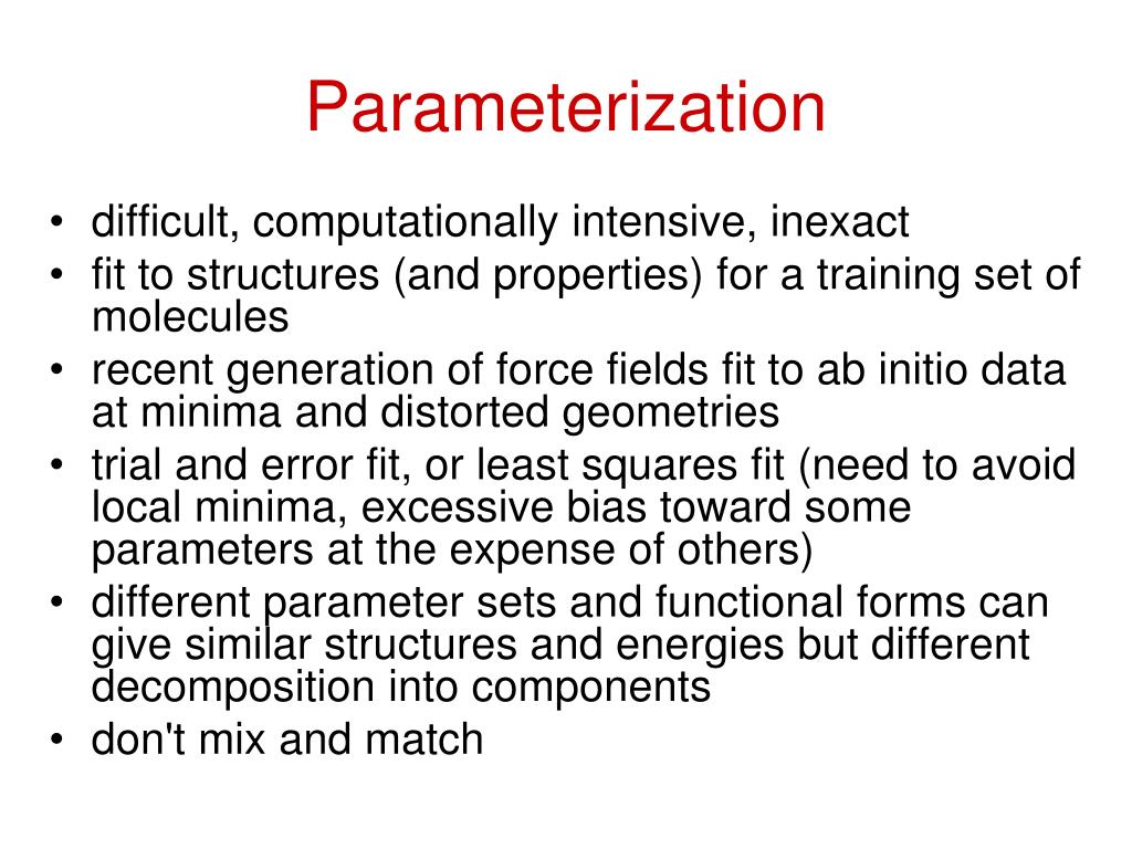 Parameterization • difficult, computationally intensive, inexact • fit to structures (and properties) for a training set of molecules • recent generation of force fields fit to ab initio data at minima and distorted geometries • trial and error fit, or least squares fit (need to avoid local minima, excessive bias toward some parameters at the expense of others) • different parameter sets and functional forms can give similar structures and energies but different decomposition into components • don't mix and match