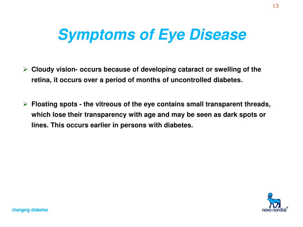 Symptoms of Eye Disease • Cloudy vision- occurs because of developing cataract or swelling of the retina, it occurs over a period of months of uncontrolled diabetes. • Floating spots - the vitreous of the eye contains small transparent threads, which lose their transparency with age and may be seen as dark spots or lines. This occurs earlier in persons with diabetes.
