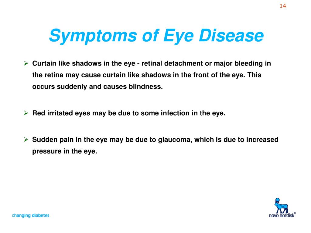 Symptoms of Eye Disease • Curtain like shadows in the eye - retinal detachment or major bleeding in the retina may cause curtain like shadows in the front of the eye. This occurs suddenly and causes blindness. • Red irritated eyes may be due to some infection in the eye. • Sudden pain in the eye may be due to glaucoma, which is due to increased pressure in the eye.