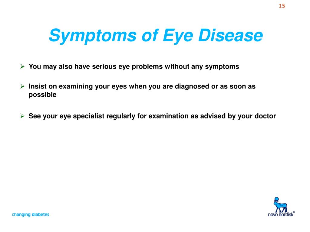 Symptoms of Eye Disease • You may also have serious eye problems without any symptoms • Insist on examining your eyes when you are diagnosed or as soon as possible • See your eye specialist regularly for examination as advised by your doctor