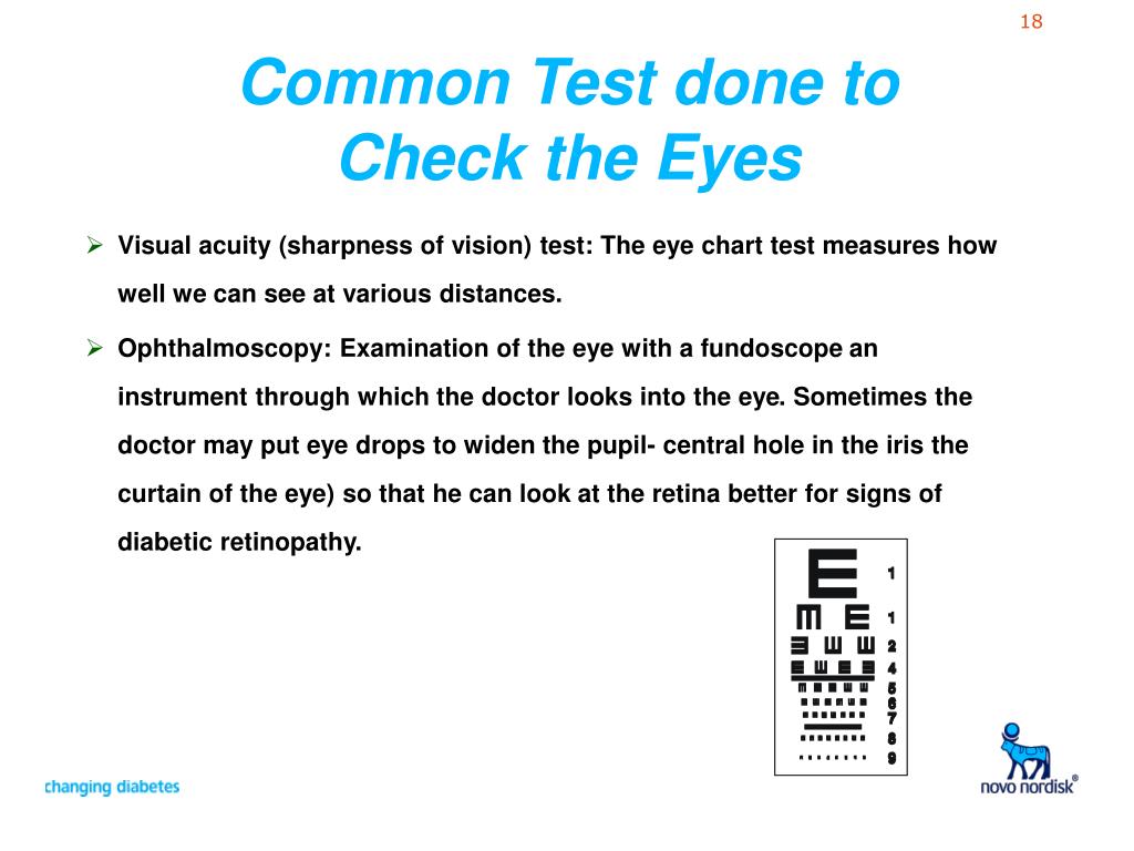 Common Test done to Check the Eyes • Visual acuity (sharpness of vision) test: The eye chart test measures how well we can see at various distances. • Ophthalmoscopy: Examination of the eye with a fundoscope an instrument through which the doctor looks into the eye. Sometimes the doctor may put eye drops to widen the pupil- central hole in the iris the curtain of the eye) so that he can look at the retina better for signs of diabetic retinopathy.