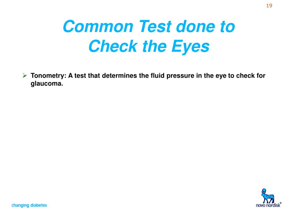 Common Test done to Check the Eyes • Tonometry: A test that determines the fluid pressure in the eye to check for glaucoma.
