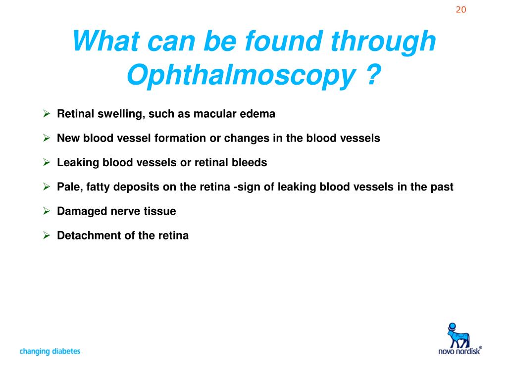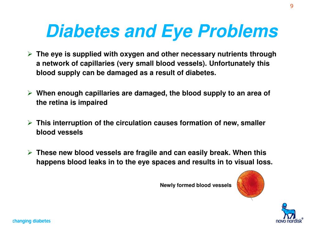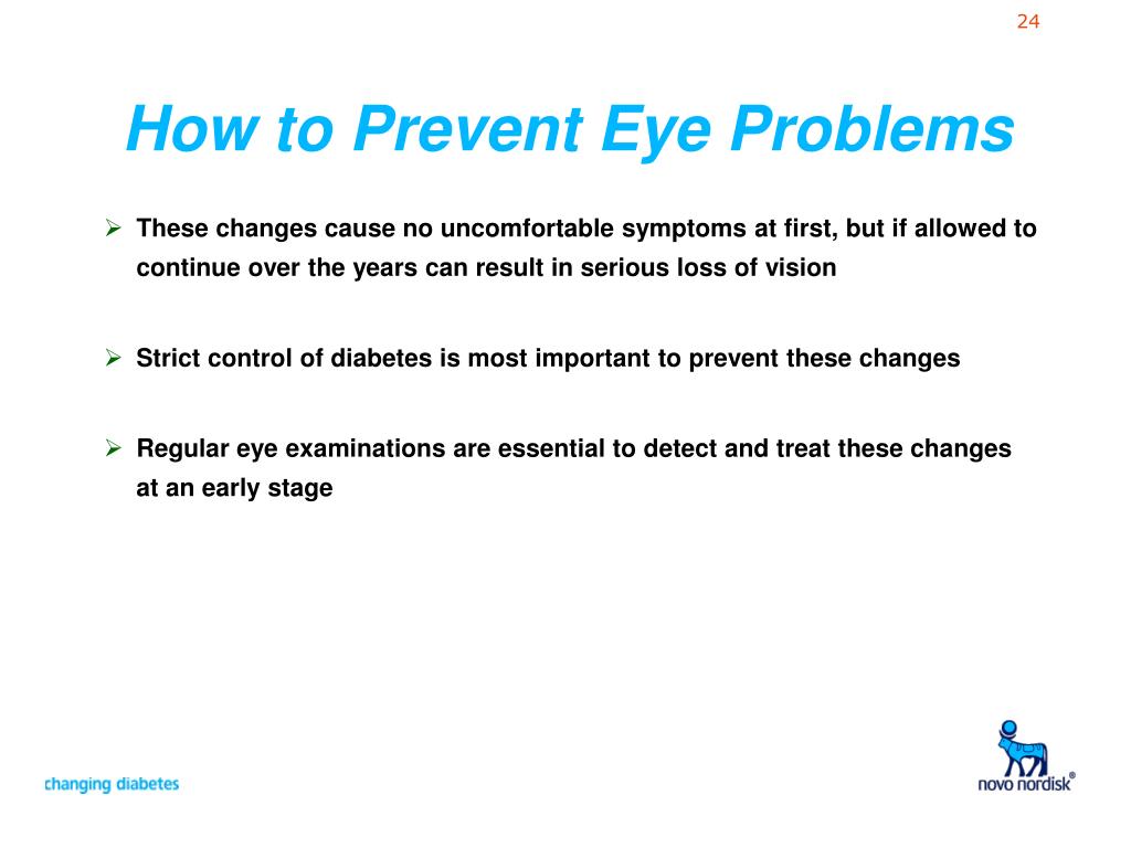 How to Prevent Eye Problems • These changes cause no uncomfortable symptoms at first, but if allowed to continue over the years can result in serious loss of vision • Strict control of diabetes is most important to prevent these changes • Regular eye examinations are essential to detect and treat these changes at an early stage