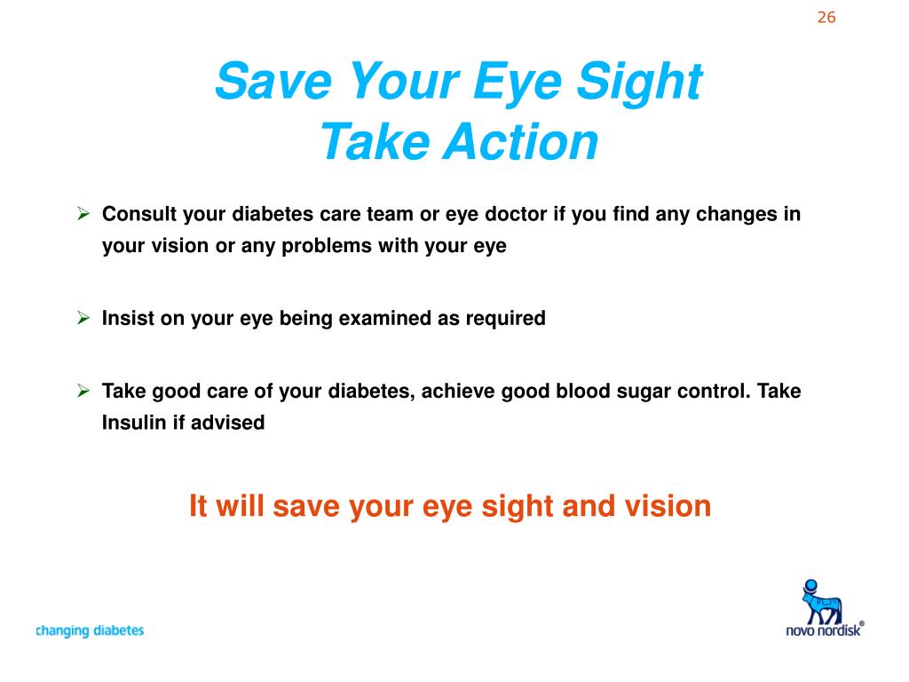 Save Your Eye Sight Take Action • Consult your diabetes care team or eye doctor if you find any changes in your vision or any problems with your eye • Insist on your eye being examined as required • Take good care of your diabetes, achieve good blood sugar control. Take Insulin if advised It will save your eye sight and vision