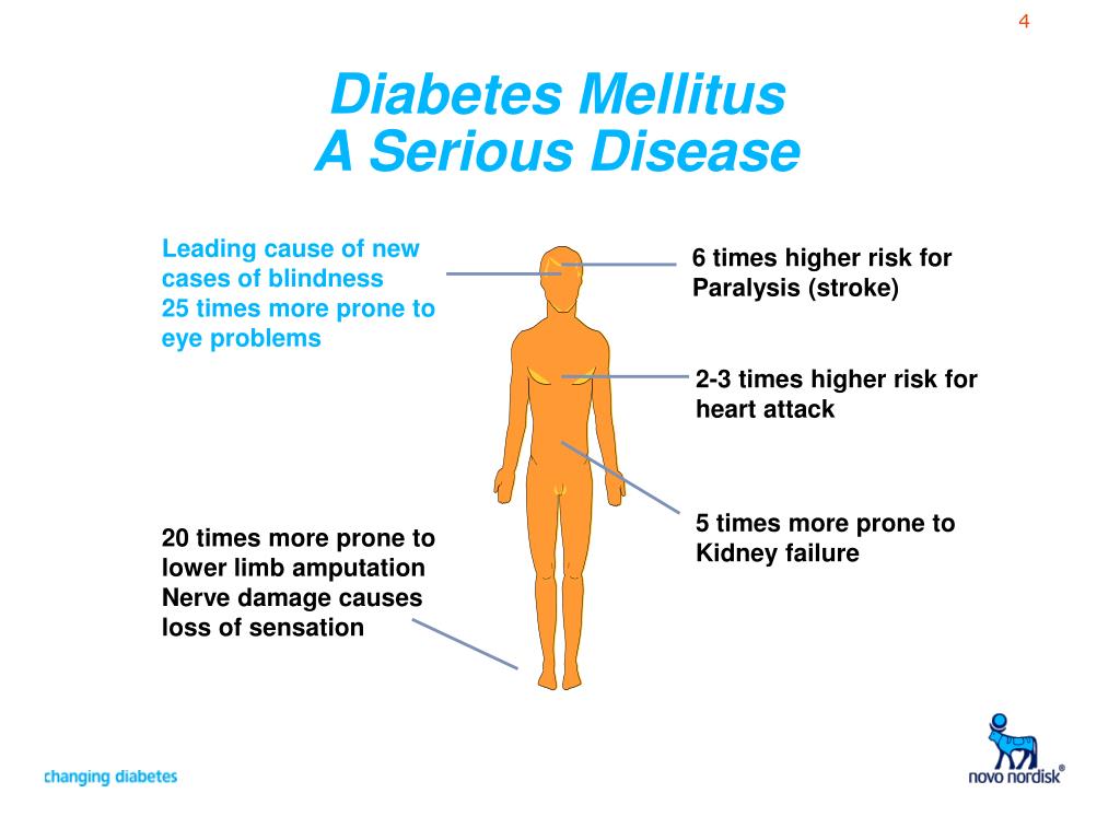 Diabetes Mellitus A Serious Disease Leading cause of new cases of blindness 25 times more prone to eye problems 6 times higher risk for Paralysis (stroke) 2-3 times higher risk for heart attack 5 times more prone to Kidney failure 20 times more prone to lower limb amputation Nerve damage causes loss of sensation