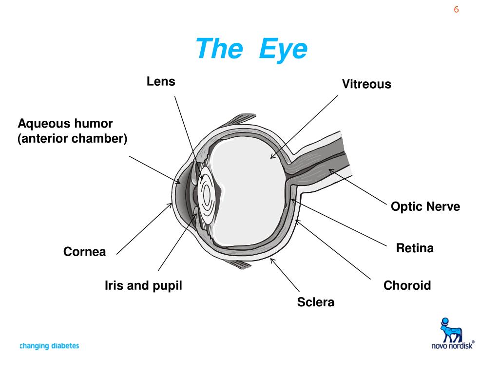 The cornea The iris; pupil and anterior chamber The lens The vitreous The retina The eye muscles Corneal erosion – ulcer in the cornea due to dryness Acute glaucoma Swelling and Cataract (lens becomes opaque) causing blurred vision and blindness Bleeding in vitreous Swelling, new blood vessels; bleeding; detachment Double vision Parts of the Eye How they are affected by Diabetes