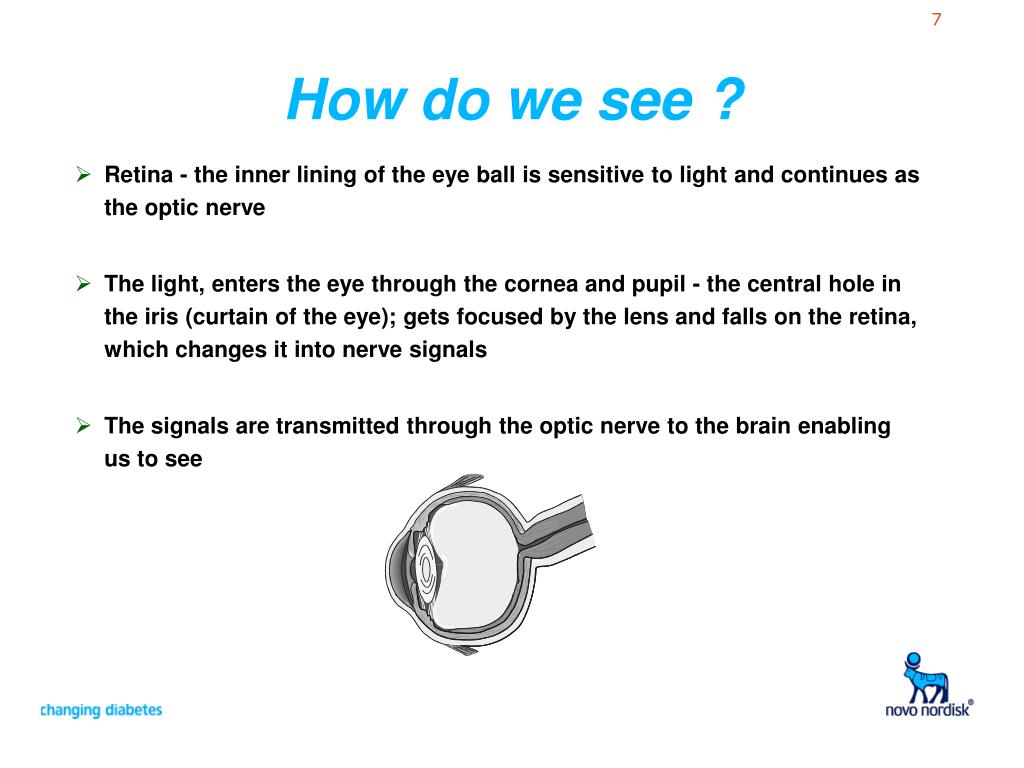 How do we see ? • Retina -the inner lining of the eye ball is sensitive to light and continues as the optic nerve • The light, enters the eye through the cornea and pupil - the central hole in the iris (curtain of the eye); gets focused by the lens and falls on the retina, which changesit into nerve signals • The signals are transmitted through the optic nerve to the brain enabling us to see