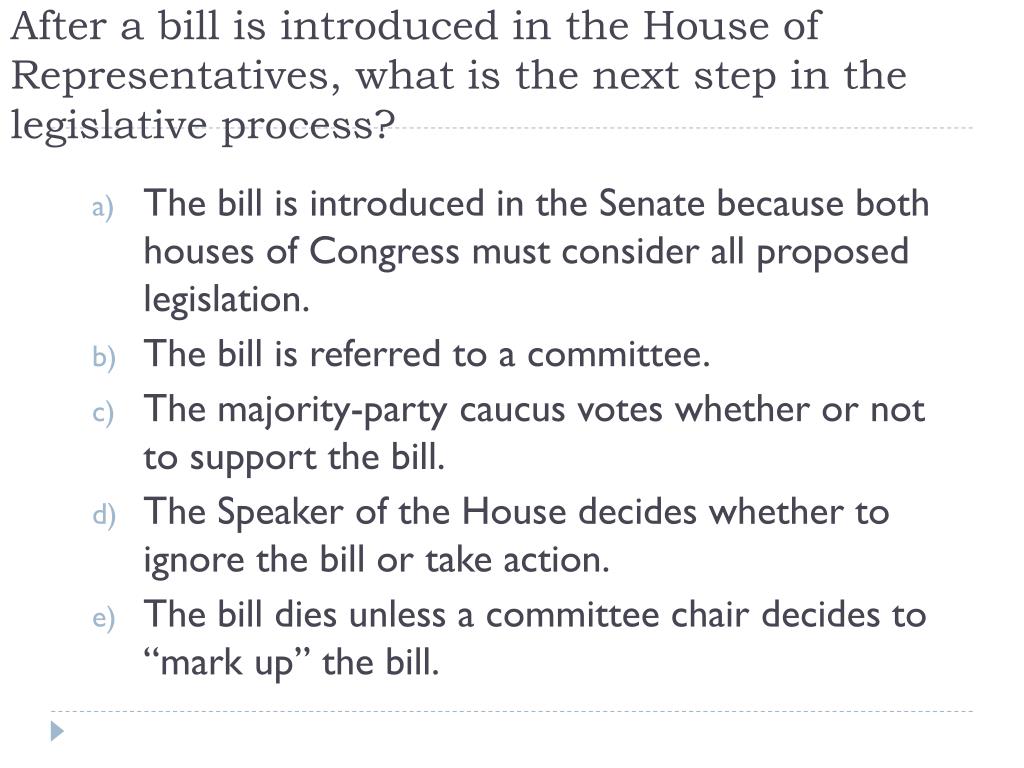 After a bill is introduced in the House of Representatives, what is the next step in the legislative process? • The bill is introduced in the Senate because both houses of Congress must consider all proposed legislation. • The bill is referred to a committee. • The majority-party caucus votes whether or not to support the bill. • The Speaker of the House decides whether to ignore the bill or take action. • The bill dies unless a committee chair decides to “mark up” the bill.