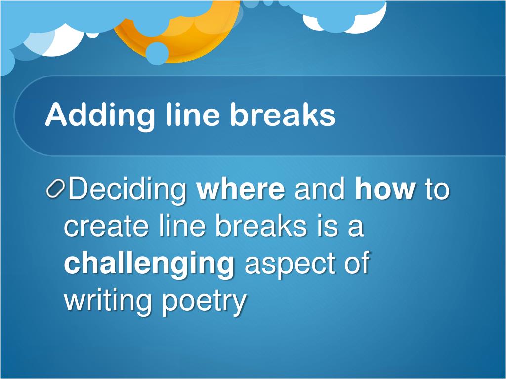 Adding line breaks • Deciding where and how to create line breaks is a challengingaspect of writing poetry
