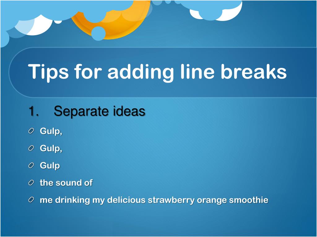 Tips for adding line breaks • Separate ideas • Gulp, • Gulp, • Gulp • the sound of • me drinking my delicious strawberry orange smoothie